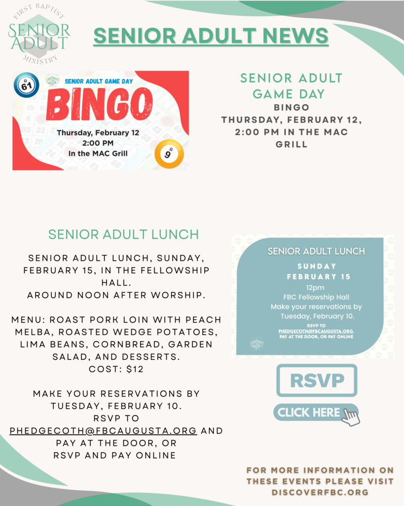 As the Minister to Senior Adults and Missions I have the privilege to welcome 55+ adults and their families to First Baptist. I have the honor to minister with adults who are thriving and growing in their spiritual formation. We worship, study, serve, and have fun together. As the Minister to Missions I help all age groups engage in service around the CSRA working closely with our Mission Pillar Team and our Missions Development Council to help live into FBC’s mission “to connect people with Jesus and our faith community”.
