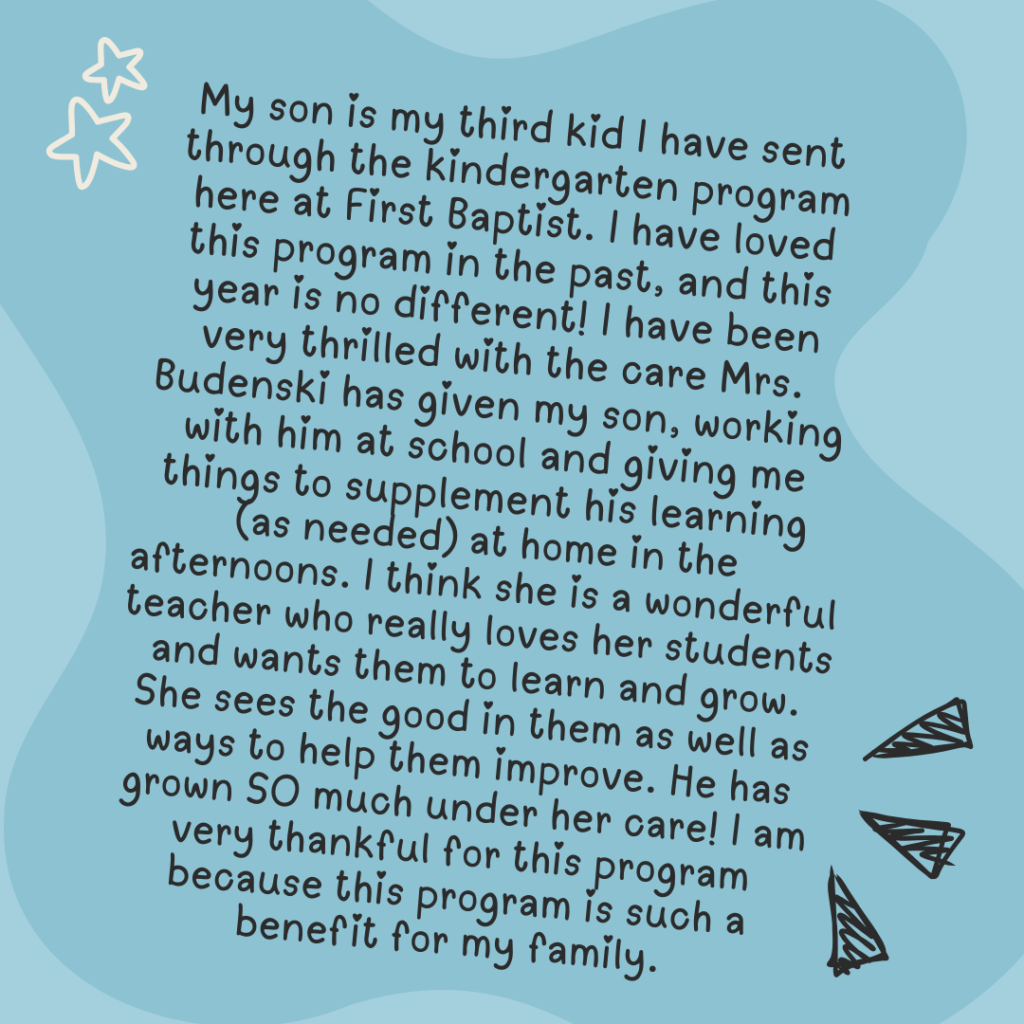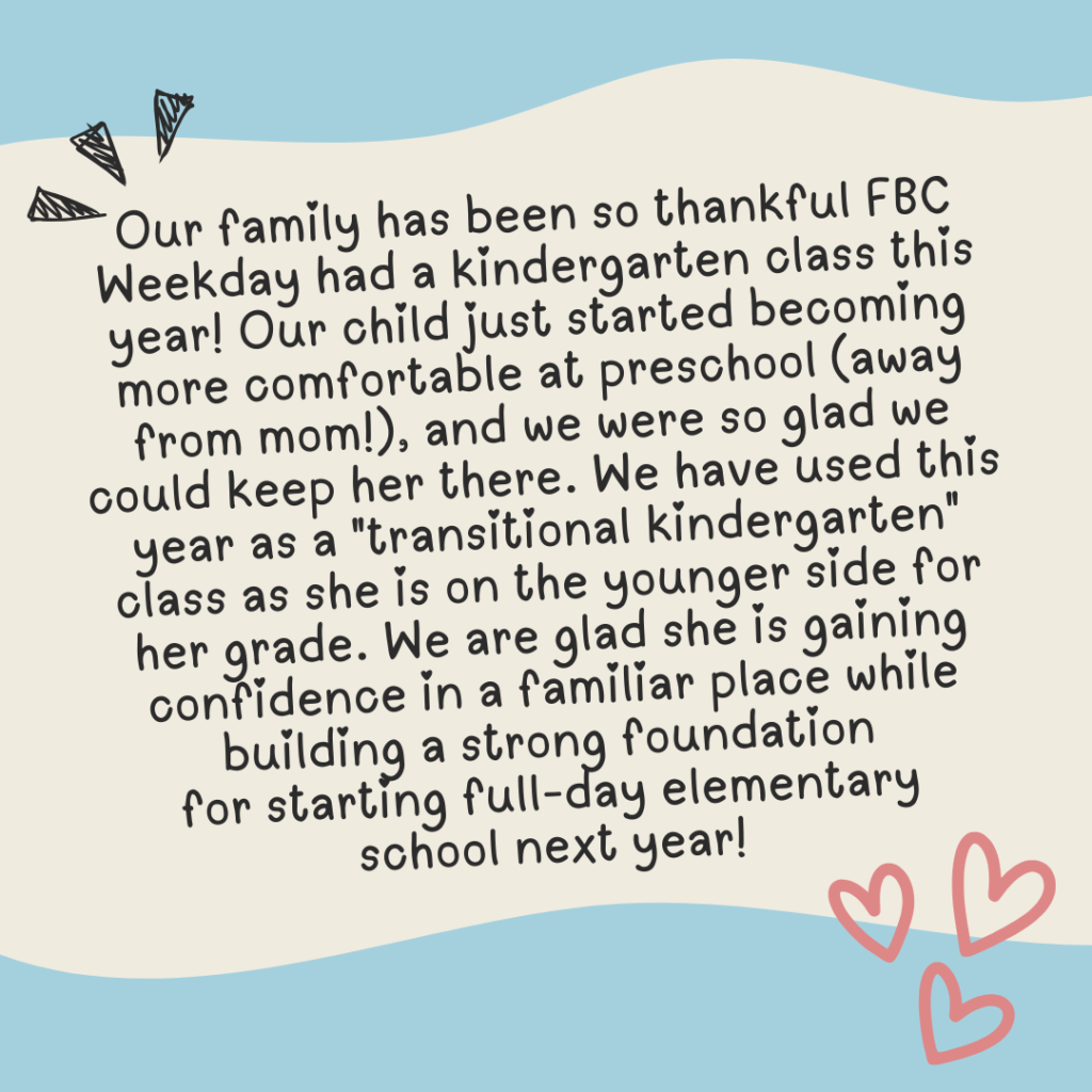 Registration is held each January, with currently enrolled families and First Baptist Church members enrolling first. The general public may register. Enrollment is open until all spaces are filled.