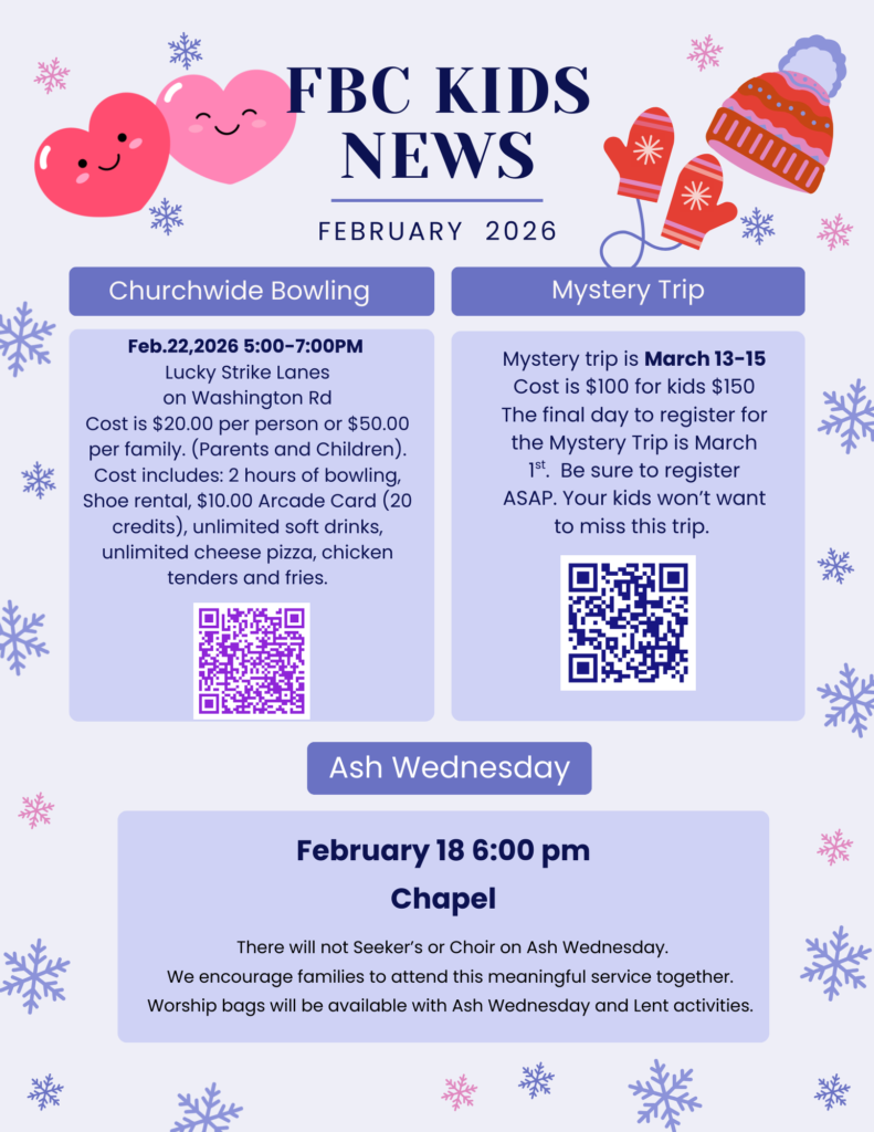 Dinner in the Fellowship Hall at 5:00 PM. Seeker’s Club for K-5th grade begins at 5:30 PM in the Kid’s Worship Room in the Children’s building. Children’s choir begins at 6:15 pm Preschool Choir begins at 6:00 pm. Preschoolers will go to the Preschool building and Children K-5th grade will go to the Children’s Building, 2nd floor. All programming ends at 7:00 pm.